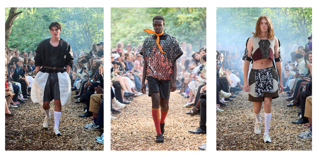 Rolf Ekroth was chosen for its strong sustainability ethos, as it is known as a brand that creates timeless, durable, and inclusive unisex clothing, with 80% of materials sourced from deadstock or recycled fabrics. Among the methods used by the designer to realize his collection, there are patchwork remixes, deconstruction and rebuilding, overdyeing, layered hybrids, and visible mending each designed to give discarded fabrics new life while preserving their original character. In addition, all garments are produced locally in Estonia and Finland, a quality that reinforces the designer’s commitment to ethical practices. LSJH’s unique material base, including Penkola second-quality knitwear, aligned perfectly with the brand’s aesthetic and values.